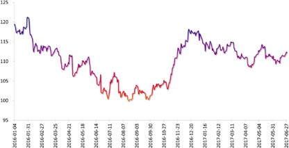 2017年下半年,日本经济基本面在疲软日元、财政刺激以及低利率政策的辅助下有望改善,这或许会为日本央行退出宽松政策带来更多讨论空间,带动日元升值。预计日元下半年波动区间【105,120】。(图9)
