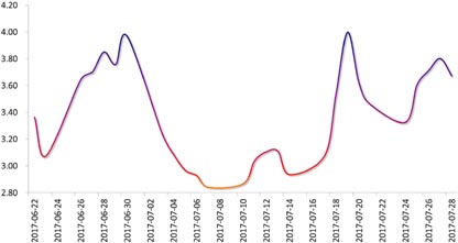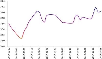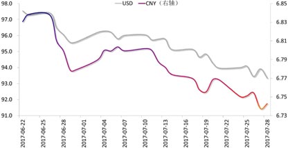 离岸人民币市场:上周,美元指数受美联储会议纪要关于通胀持续低于目标的表述、疲弱经济数据及朝鲜发射洲际导弹的影响,最低触及93.25,创14个月新低。离岸人民币继续对美元走强,最高触及6.7342,为去年10月以来新高。离岸人民币掉期点也继续维持低位,市场流动性充裕。