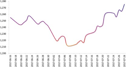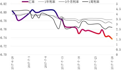 外汇市场:上周,美联储7月FOMC会议结果较市场预期更为鸽派,美元指数走低。人民币兑美元趁势走升,但在实需客盘逢低购汇的影响下,人民币暂徘徊在6.73附近,周五收报6.7320,当周累计上涨0.37%。