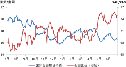 一季度,贵金属快速上涨阶段,受益欧美通胀指标高企影响,白银走势强于黄金,金银比价小幅下跌;二季度,欧美通胀指标显著回落,有色板块整体下跌,商品属性更强的白银走势疲软,4月一度下跌至16美元/盎司附近,接近年初低位,其后在年线下方的低位区间震荡,金银比价相应拉升并在高位震荡。