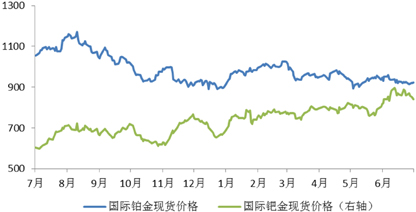 上半年,铂钯走势波动整体仍跟随黄金,但受基本面因素和市场预期影响,钯金价格逐渐逼近铂金,钯金涨幅领先贵金属,而铂金涨幅则为最低,铂钯价差整体维持缩窄态势,收于82美元/盎司,最低跌至40美元/盎司下方。国际现货铂金收于923.47美元/盎司,上涨2.48%(图3)。国际现货钯金收于841.50美元/盎司,上涨24.02%。