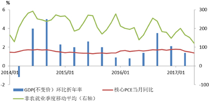 出于金融安全考虑,美联储货币政策正常化态度坚决。尽管近期经济数据相对疲软,特别是通胀指标显著回落,距离联储之前的2017年度通胀预测——1.9%有相当差距,美联储6月议息会议继续推出加息。从5月、6月会议的决议和纪要来看,美联储对于经济数据的强调已不如从前,短期数据疲软不会改变货币政策正常化进程,预计联储大概率将落实年内加息三次并启动缩表的计划。