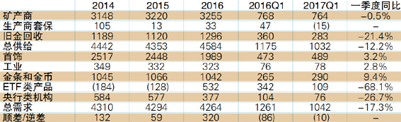 2017年一季度,黄金需求同比下降17.3%至1042吨,主要受ETF投资和央行需求同比下降所致,实物金消费同比有改善。供给同比下降12.2%至1032吨,主要源于回收金和生产商套保卖出的下降,矿产产量则基本稳定。