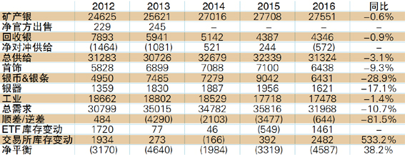 2016年全球实物白银消费需求下跌10.7%,供给则小幅下跌3.1%,实物供需逆差大幅收窄至644吨,供需基本面更趋均衡;投资性库存大幅增长,ETF持仓和交易所库存增长均超过2000吨,净平衡缺口有所扩大,投资性需求日益重要。(表2)