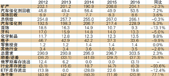 库存方面,2016年铂金ETF投资净流出0.2吨,显示投资者对铂金兴趣仍未修复。近两年行业和ETF库存变动较小,对市场影响力较弱。(表4)