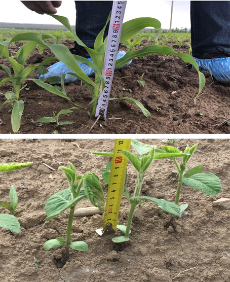需要注意的问题是,当前玉米处于关键的三叶期,主要是进行根、叶的生长和茎节的分化,此阶段怕涝不怕旱,轻度的干旱有利于根系的发育和下扎。今年雨水过多,玉米的根系普遍较浅,如果后期遇到干旱或者风灾对产量的影响将会非常大。沿途大豆和玉米采样调查如下: