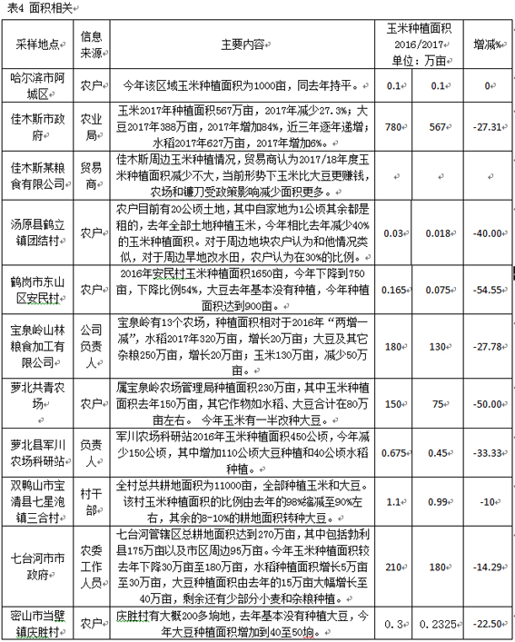 种植面积方面总共采集了10个样本,所包含的地区2016年玉米种植面积为1322.37万亩,2017年为953.87万亩,总样本玉米种植面积减少27.87%。单个样本中种植面积减少最小的地区为0,最大的地区减少幅度为54.55%。从数据来源来看,政府、农垦等人员提供的样本减幅在15%-30%应该是相对可信的,大豆的种植面积增幅至少为10%。