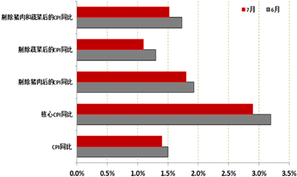 中国7月包括进出口、工业增加值、固定资产投资、房地产开发投资、社会消费品零售总额等在内的主要宏观经济数据全线回落,整体弱于市场预期,但同季末数据异动后,在季初又反向变动有关(3-4月、6-7月均是如此)。国家统计局称工业产出放缓主要是受天气和去产能影响,并且预计下半年投资将基本持稳,经济将继续平稳运行,出口也将保持稳中向好趋势。此外,居民消费价格涨幅超预期下行,工业品价格涨幅平稳,暂未看到长期通胀压力;M2增速再创历史最低,但货币指标的指示意义已减弱;信贷融资仍然强劲,债券融资有所恢复,而表外融资仍然疲弱,企业中长期融资增速未见明显好转,同相对较弱的实体经济数据相印证。