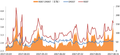 8月7天回购利率月度中枢较7月的3.32%大幅上行15bps至3.47%,与资金面最紧张的3月持平;存款类机构7天回购利率月度中枢上行7BP至2.88%,较3月高12BP;(R007-DR007)价差中枢较上月上行15BP至66BP,仅比3月低5BP。(图2)