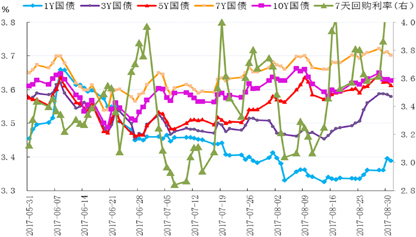 7月召开的第五次全国金融工作会议提出,“要把发展直接融资放在重要位置”。今年以来由于利率波动较大、监管措施加强,导致债券市场融资锐减。如果要提高直接融资比重,需要适当降低企业融资成本,才可充分发挥债券市场的融资功能。在此背景下,预计9月债券收益率不具备大幅上行的基础,特别是在十九大召开之前市场将不会出现过大波动,央行也会适当投放流动性进行“填谷”操作,保证资金面不会过于紧张,引导资金利率高位回落,因此预计9月债券收益率的实际上行空间有限。