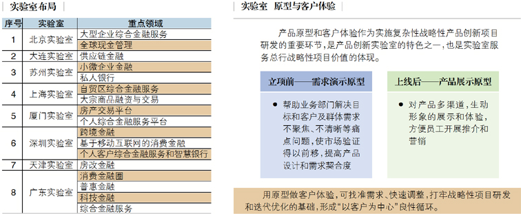 在学习和借鉴美国银行产品创新实验室技术的基础上,经过半年时间的努力建设,北京产品创新实验室成为建行第一个实验基地,随后,在大连、苏州、上海、厦门、深圳、天津、广东也先后建成了产品创新实验室。实验室围绕建行产品创新战略重点,进行创意集成、原型设计、场景模拟、测试优化,计划每年提供一定数量、可供开发的战略型和扩展型新产品创意。2014年,总行下发了《关于加强产品创新实验室建设的实施方案》,明确产品创新实验室的定位为:总行战略性产品研发平台、客户参与创新平台、内外部联动创新平台和创新展示与发布平台。根据上述定位,近年来,产品创新实验室开展了一系列工作,在全行产品创新工作中发挥了积极的作用。