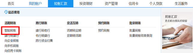 95533答: 个人网银智能转账是建行全新推出的一项服务,支持向建行账户、他行账户办理转账。您选择智能转账后,不再需要选择转账类型,建行会根据收付款账户信息自动识别,方便您简单操作。具体操作流程为:登录个人网银(www.ccb.com),依次点击“转账汇款-活期转账-智能转账”,按页面提示即可办理转账。