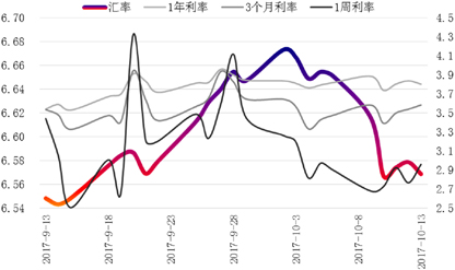 外汇市场:上周,由于欧洲经济数据强劲、西班牙政治风险暂缓和美联储9月会议纪要不及预期鹰派, 美元指数震荡下跌,人民币顺势上涨。加之十九大召开在即,央行行长周小川呼吁放松外汇管制,市场看多人民币情绪升温,但由于客盘购汇力量增强,人民币回吐部分涨幅,周五收于6.5868,当周累计上涨0.91%。短期人民币料将延续区间波动。