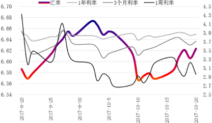 离岸人民币市场:上周美元指数在市场对美联储12月加息的预期再度升温的情况下(目前联邦基金利率期货隐含的12月加息概率已突破80%)从93小幅反弹至93.66。离岸人民币则基本跟随美元走势,全周兑美元贬值约600个点至6.6623。各期限掉期点小幅波动,市场流动性仍然充裕。