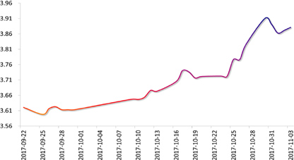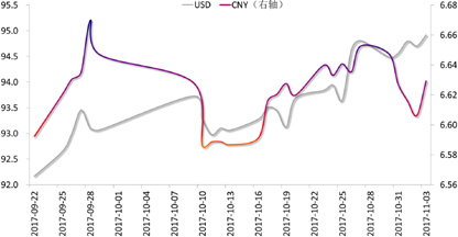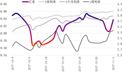 外汇市场:上周,因美联储货币政策会议按兵不动及特朗普提名美联储理事鲍威尔为下任美联储主席,均符合市场预期,美元指数波动不大。在月初市场结汇需求的拉动下,人民币兑美元上涨;随后,在美元相对偏弱的背景下,市场逢低购汇情绪旺盛,人民币涨幅收窄,周五收于6.6295,较前一周上涨0.37%。