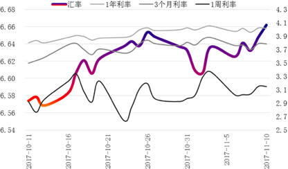 离岸人民币市场:上周,随着境内人民币兑美元中间价小幅调贬,离岸人民币兑美元也未能延续前一周的反弹趋势,当周小幅贬值约200点。各期限掉期点保持稳定,市场流动性仍然充裕。