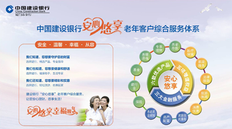 为积极配合厦门打造全国最佳养老城市,建行特意以厦门市分行作为首批试点,构建了建行系统全国第一个老年客户金融生态圈并推出了“安心悠享”老年客户综合服务方案。该方案和以往最大的不同在于,建行除了能一如既往地为老年客户提供存取款、投资理财等金融服务外,还能为老年客户提供“衣、食、住、行、娱、医”等多方面的非金融服务,让广大老年客户“安心理财,悠享生活”。