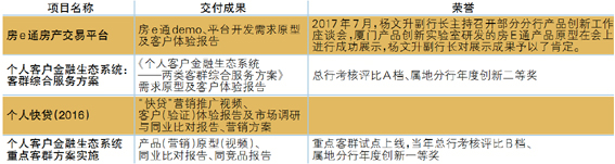 从2015年开始,实验室发展翻开了崭新的一页。当年总行下达加强实验室建设实施方案,明确厦门产品创新实验室重点领域一是房产交易平台,对口总行住房金融与个人信贷部,以建行“房e通”网站为依托,研究建立房产交易平台,将之打造成涵盖线上选房、交易、评估、资金监管、申请贷款等功能的一站式房产交易融资平台。二是个人综合金融服务平台,对口总行个人存款与投资部,以全量个人客户为目标群体,深入发掘客户需求,整合建行集团资源,针对不同细分层级的客户群体提供综合化、差异化服务,打造个人客户综合金融服务平台。