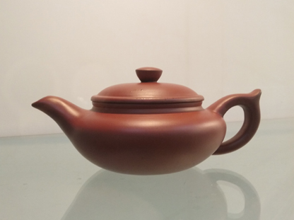 壶形简练精致,壶体呈扁鼓腹,圆口短坡颈,壶内底凸起;管状流,配环形把,把上有一尾上翘;帽形盖,弧状,盖钮巧妙地凸起,令壶的重心上移。泥色赭红,温润雅致,壶器线条简洁流畅,形制朴素,壶身干净无雕饰。紫砂质地温润细腻,握在手中柔和舒适。顾景舟大师在制壶上已到达了一种高超的境界,他制的壶不仅仅是种工艺,而是一种创造。此件紫砂壶,整体给人端庄大方古朴典雅之感,极为难得,值得收藏。