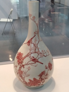 这件画工精湛的胆形瓶给我留下了极深的印象,细长的瓶形就招人喜欢,淡淡的底色绘上精致的矾红,对比度极为协调和谐,玉兰绽放还有众多的蓓蕾,旁边配有富贵牡丹给人一种大气经典的感觉,画工高超非大师不能为也,倘若放在家居陈设,大有蓬荜生辉的感觉!