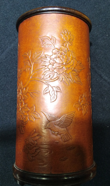 这件匏器笔筒是用钝玛瑙刀掐出来的花卉,因而能够让象征富贵的牡丹突出于器表,这种工艺逐渐失传,偶尔还能看到这种流传下来的实物,但能经营此道的人是越来越少,我曾在潘家园葫芦徐的店里采访过徐肇庆老人,他有让人掐过的葫芦,这种工艺不是一次成型而是要分多次完成,他请名家掐葫芦一次收费几百块,您看看这件匏器笔筒的牡丹是突出于器表的,难度极大,因而这种纯手工艺技艺实在应该保护流传下来。