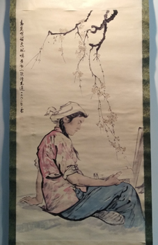 大家知道蒋兆和先生是我国著名的人物画大家,有大师风范,蒋先生的人物画珍贵且难得,在国际拍卖行上他的画屡创新高。这幅画是蒋先生1961年8月所绘,主人公是位妇女,蒋先生题款“春风明媚东风暖,劳动小歇读毛选”。这位妇女在田间地头小憩,坐在地上聚精会神地看着毛主席的书,上面垂下一枝错落有致的枝条,伴随着妇女读书的画面很是感人。