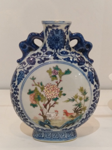 这件精致的青花开光月形壶,器形不大,在开光的圆内绘有精致的粉彩花卉,主图是两只公鸡,一只白、一只红头墨尾,它们在对视着,不知是和谐相处还是一场你死我活的厮杀……画面是极美的,以前见到的这种月形壶大多体型巨大,明代永宣以前的月形壶使用苏麻离青颜料,晕散程度中可以清晰地看出那种蓝中泛青的色釉,这种小而美的月形壶着实让人喜爱……
