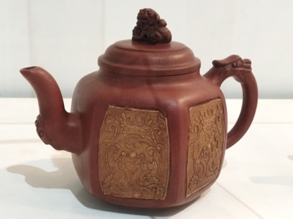 这把紫砂壶是在刚刚开始参观时就看到的,壶制作得大气富贵,壶的两面各嵌有两片黄泥片,装饰着螭龙图案,壶把也是螭龙吞首,壶盖上蹲着只小兽憨态可人。泥质细腻红中泛紫,不失是把上等紫砂壶,底价50万元。