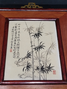 这件瓷板画是郑板桥的竹子,画面的中心所绘竹子两杆较为粗壮的竹子,三根细细小竹伴随在粗竹的旁边,竹叶疏密有度,阴阳向背、浓淡和谐,竹后映衬块嶙峋怪石,给人一种蓬勃向上的自信力,竹节中空预示着文人之气节,旁边题有郑板桥作于丙子年初春画的诗:“四十年来画竹枝,日间绘写夜间思,冗繁削尽留青瘦,画到生时是熟时。”我很崇拜郑板桥的竹石,我将一部分今天观看预展的照片发在网上,朋友成华微信告我,就看上这件郑板桥的竹瓷画了,问我多少钱,拍摄照片时还没标签。小小瓷画大不过盈尺,镶嵌在木框之中,倘若悬挂在家中是好的选择。