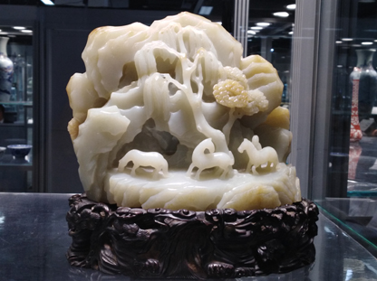 这件黄中泛白的玉石山子,高在20余厘米,宽也不下20厘米,如此大的玉料较为难得,且玉质细腻白中透着润,巨大的随形山峰雕有层次,中间靠右有株垂柳及另一种灌木与之相向组合在画面之中,平台上是三匹马与一人,画面和谐生动,雕工具有乾隆时期的风格,不仅有圆雕更多的是透雕,雕琢难度极大,不失为家庭高档次之陈设品。