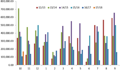 本月共有50家信托公司发行了261款产品,环比减少3款,降幅为1.14%。发行量环比变动不大,依然维持近期高位。(图5)