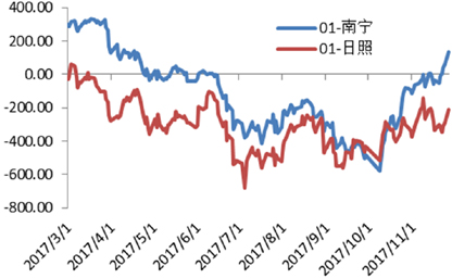 11月份,郑糖801合约的基差变化很大,总体呈缩小之势,造成基差缩小到主要原因是期货的大幅上涨,而现货由于新旧榨季交替时期陈糖跌价,新糖报价相对稳定。南宁现货基差月初在100元/吨,月末跌至-100元/吨,不过这是按陈糖报价计算的,若是按新糖报价则基差不到-100元/吨。同期,805基差逐渐缩小,月初在350元/吨,到了月底缩小至170元/吨。(图1)