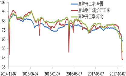 截止11月24日,据Mysteel统计的100家焦化厂焦炉产能利用率为68.34%,比月初下降了4.52个百分点,受限产影响,焦炉产能利用率持续下行,从减幅来看,相对于上个月下行幅度有明显的缩小,且目前受焦炭价格提价影响,焦化厂利润尚可,预计不会再大幅下行。高炉开工率方面,11月份全国开工率指标呈下滑态势,特别是河北、唐山地区高炉开工率下行最为严重,河北钢厂开工率由月初的66.03大幅下行至月末的52.06,而唐山开工率也由月初的70.99大幅下行至43.29。下行原因不外乎环保限产和钢厂检修两大因素。但是从周度短周期来看,高炉开工率下行速率有所减缓,近一周开工率仅有极小幅度的下跌,企稳迹象明显。(图4)