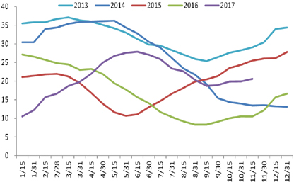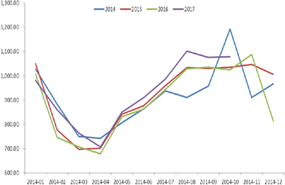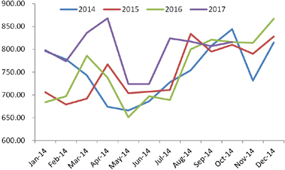广西糖网数据显示,11月初时配额外巴西原糖加工利润在530元/吨上下,配额外泰国糖加工利润在500元/吨上下,此后国内糖价稳步上涨,而原糖价格出现回落调整,加工利润逐渐扩大,两国的原糖配额外加工利润都达到过610元/吨水平,但后来随着原糖开始走强,而国内糖价开始走稳,加工利润有所回落。月末配额外巴西糖加工利润420元/吨上下,配额外泰国原糖加工利润也在420元/吨上下。海关数据显示,中国2017年10月份进口食糖17万吨,较去年同期增加6万吨(去年同期进口11万吨),和过去五年相比这个进口量是很低的。(图2)