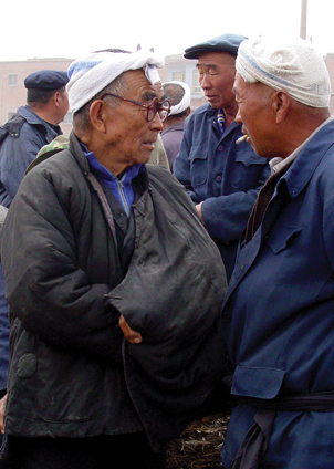 早年间,东阳老汉的装束是一道靓丽的风景线。他们习惯头上扎毛巾,一张张饱经风霜、刻满皱纹的面容,透着憨厚和友善,卷成圈儿的毛巾围在头上还个结,显得轻松和惬意。最吸引人的是那黑色的连襟大棉袄和缅裆裤,束上条布腰带,加上每个人的神态和眼神,处处透着纯朴的民风和东阳人独特的生活方式。随着时代的变迁,这样的装束已经很少了。村子的土房子变成了一排排的二层、三层小楼,交通工具也先后由自行车换摩托车再到电动车,当然穿西装、夹克的老汉也就多了起来,唯一不变的是那头上扎的头巾。不过毛巾的品种也多了起来,除了白羊肚毛巾,也多了暗红的、蓝条纹的、菱格的、小花花的毛巾,虽然许多摄影人不满意老汉们衣着的变化,认为失去了当地特色,但是我们也不能阻止时代的变化啊,老汉们也要与时俱进嘛。