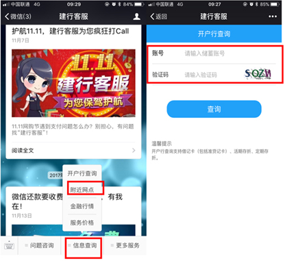 95533答:最近我行推出了“建行客服”微信公众号,您关注“建行客服”公众号后即可查询储蓄卡的开户行信息。查询方法为:进入“建行客服”微信公众号,依次点击下方菜单栏的“信息查询-开户行查询”,输入账号及验证码后点击“查询”即可。除可以通过“建行客服”微信公众号查询外,您还可以通过我行电话银行、短信银行等渠道查询。
