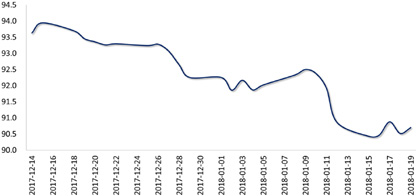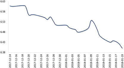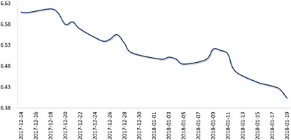 上周,美元指数弱势难改,盘中一度触及90.103的三年低位,目前在90关口上方盘整。在疲弱美元的拉动下,人民币兑美元汇价大幅上涨,一度突破6.39关口,刷新25个月来新高。此外,好于预期的中国2017年全年经济增速数据也助力人民币延续强势,人民币兑美元周五收于6.4040,当周累计上涨0.59%。短期内预计美指弱势难改,人民币料易升难贬。