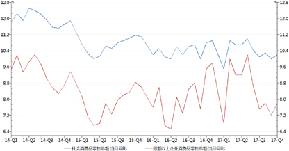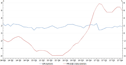 展望2018年,党中央明确了以新发展理念为主要内容的习近平新时代中国特色社会主义经济思想,将继续深化供给侧结构性改革,重点在“破、立、降”上下功夫,激发各类市场主体活力,提高保障和改善民生水平,打好防范化解重大风险、精准脱贫和污染防治“三大攻坚战”。中国的宏观经济预计将保持韧性,在全球经济同步增长的背景下,海外需求或仍将保持稳定,带动出口平稳增长;经济回暖带动居民收入增速回升,居民消费对GDP的贡献有望继续提升;稳增长压力降低,基建投资、房地产投资或小幅下滑,制造业投资在企业利润好转及低基数作用下可能触底回升。CPI受内外需改善和PPI传导影响预计将温和回升至2%以上,通货膨胀压力不大。积极的财政政策取向不变,确保对重点领域和项目的支持力度,“营改增”和结构性减税继续深入,降低企业成本,切实加强地方政府债务管理,推进地方政府存量债务置换工作。货币政策将继续保持稳健中性,管住货币供给总闸门,保持货币信贷和社会融资规模合理增长,更好地服务实体经济,守住不发生系统性金融风险的底线。