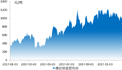 2017年,钢铁市场整体呈现宽幅震荡格局。以螺纹钢为代表的钢材产品价格走势偏强,年中创出新高,全年上涨30.33%;铁矿石作为原材料,走势相对较弱,年初一度冲高,但未能创新高,此后震荡走低,全年下跌4.15%。钢铁产品和原材料价格的强弱分化,令钢企盈利情况大幅好转,螺纹钢盘面利润持续维持高位。