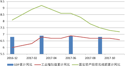 GDP:2017年三季度GDP同比增长6.8%,前三季度累计同比增长6.9%,比去年6.7%增速有所提升。虽然年末略有下滑迹象,但全年6.8%的增速目标基本达成。从消费、投资和净出口三项贡献度来看,2017年前三季度三者贡献占比分别为64.5%、32.8%和2.7%,去年为64.6%、42.2%和-6.8%。从中可以看出,2017年得益于海外经济复苏,净出口明显改善,经济增长对投资的倚重程度也有所弱化。从GDP累计平减指数来看,第一产业和第三产业基本稳定,第二产业平减指数增长6.4%,较去年-1.0%增长明显,大宗商品价格普遍上涨。