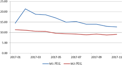 从货币供给端的M1和M2货币供应量指标来看,2017年1-11月M2同比增幅持续回落,M1增幅在2月后也是持续下降,截至11月底,M1和M2累计同比增幅分别为12.7%和9.1%,2016年为21.4%和11.3%。(图4)