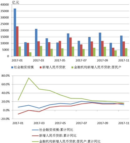从资金需求端的社会融资情况来看,2017年社会融资规模总体略有下降,融资渠道向贷款集中,居民贷款增幅大幅下跌。截至11月底,累计社会融资规模182,992亿元,累计新增人民币贷款132,662亿元,其中居民户新增贷款68,006亿元,分别较上年同期增长13.1%、15.9%和16.6%,2016年该三项数据的同比增幅分别为15.5%、10.4%和63.6%。(图5)