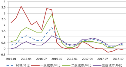 首先,从房价方面来看,2017年70个大中城市新建商品住宅价格增长速度明显放缓。本轮房地产牛市拐点已在2016年底出现。(图6)