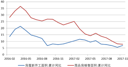 其次,从房屋销售和开工面积情况来看,本轮房地产牛市起于2016年初,终于2017年一季度,二季度为拐点。具体而言,2014-2015年处于负增长状态,2016年转入正增长并持续上升,2017年二季度见顶,并在此后持续下行。(图7)