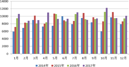 固定资产投资完成额:2017年1-11月固定资产投资完成额累计同比增长7.2%,较2016年8.1%的增速有所下滑,这也与GDP中投资贡献度占比相互印证。从月度数据来看,一季度是投资旺季,3月为拐点,此后固定资产投资增速持续下滑。投资作为总需求以及钢铁等大宗商品需求的来源,其变化和钢铁价格走势也存在一定程度的相关性。(图3)