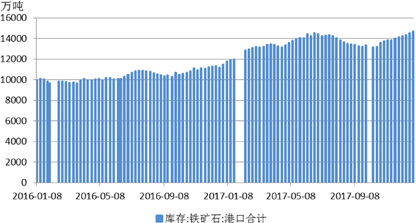 作为钢铁生产最主要的原材料,2017年铁矿石供给总体进一步宽松。国际铁矿石巨头的产能加速释放,巴西和澳大利亚铁矿石发货量创历年新高,带动国内铁矿石港口库存创历史新高。2017年,巴西和澳大利亚两大铁矿石主产区的铁矿石发货量分别为3.69亿吨和8.24亿吨,合计发货量较2016年高出0.69亿吨。国内港口库存也大幅攀升,2017年底时达到1.46亿吨,远超较2016年底的1.14亿吨。(图12、13)