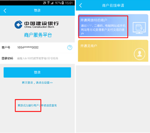 95533答:我行提供了自助签约开通服务,您进入我行企业手机银行APP,在首页选择“商户服务”频道,点击左上角“登陆”按钮进入商户服务平台登录页面,依次点击“我想成为建行商户-开通网络特约商户”,填写商户基本信息,并上传证件信息,待我行审核通过后即成功开通。成为我行网络特约商户后,您可通过APP保存或打印收款二维码,方便顾客使用我行手机银行、微信、支付宝、银联云闪付等APP扫码购买您的产品,实现快速结算。
