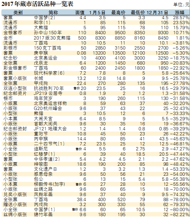 2017年的币市并没有出现如邮市般大跌,而是继续着前些年的阴跌走势,无论是前期品种还是新发行的近期品种,跌幅都明显小于邮市上的同期品种,究其原因主要是由于一方面币市上的品种连续多年下跌,累计跌幅已深,继续下探的空间有限,另一方面则是币市上炒作品种凤毛麟角,低迷市道中炒作难以为继,且大多数新品种开盘价格溢幅有限,导致了后市回调空间变得局促,因此总体看绝大多数品种的下跌幅度较狭小。但这并非说明币市已处于筑底形态,相反仍有许多品种在过去的一年中创新低,而且成交也十分稀疏,弱势特征尚未完全改变。
