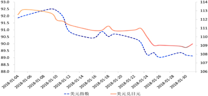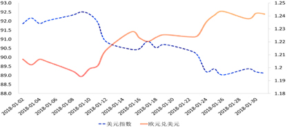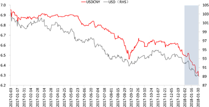 既然被动型升值的成分较高,那么美元指数的影响便尤为重要。1月,打压美元指数的无外乎两方面因素:一是外部强劲的欧元。欧元区经济数据表现亮眼,加之欧洲央行在12月货币政策会议纪要中表示要逐渐调整与货币政策相关的前瞻指引,以反映经济增长前景的改善,提振了市场对欧洲央行收紧货币政策的预期,欧元快速上涨,令美元承压。二是内部不稳定的政治局面及希望美元贬值的官方态度。1月,美国政府再次经历了短暂“关门”,尽管市场对此已“习以为常”,但整体仍令美元承压。此外,1月24日美国财长努钦在达沃斯论坛上表示“美元走弱有利于美国贸易”,进一步导致美元的快速下跌。利好未见,利空频发,共同打造了疲弱的美元。