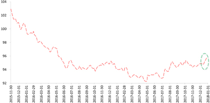 但近期经济基本面与政策面对英镑难言利好。首先,英国今年1月制造业PMI连续第二个月回落,截止2017年11月的三个月ILO失业率维持在4.3%的低位,但薪资增速仍不及通胀,实际收入继续下降,英国消费行业仍然疲软。第二,英国12月CPI小幅回落至3%,表明通胀峰值可能已经过去,市场普遍预期英央行2月不会加息。第三,英国国家统计局指出2017年英国经济增速1.8%,为2012年以来最低,预计2018年将进一步放缓至1.4%。第四,英国首相梅开启第三次内阁重组但未带来新气象,在经历去年艰难的脱欧谈判和近期丑闻事件后,市场对英国政府的执政能力愈加怀疑,第二阶段脱欧谈判不确定性高企。